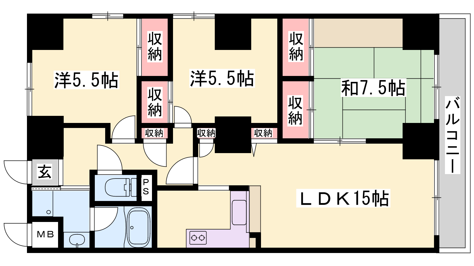 - LDK15帖、洋室5.5帖、洋室5.5帖、和室7.5帖