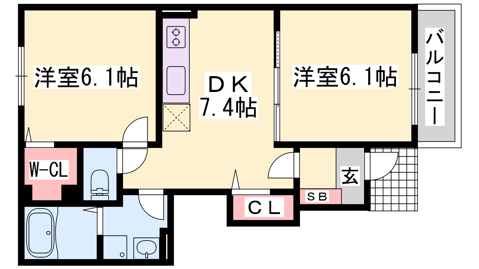 - DK7.4帖、洋室6.1帖、洋室6.1帖
