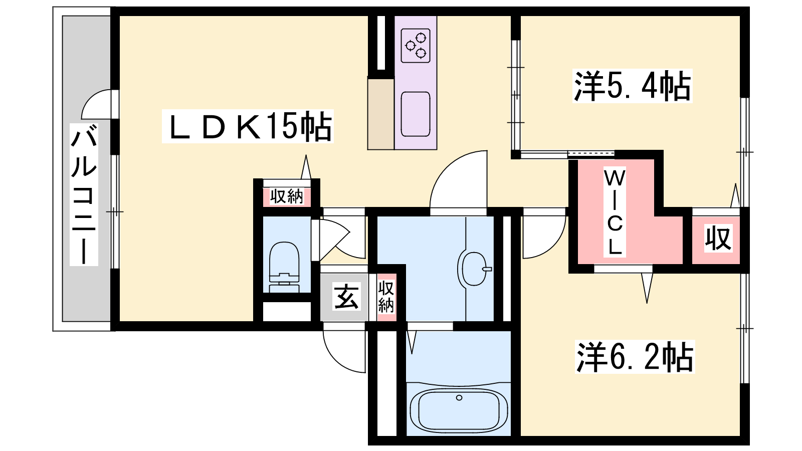 - LDK15帖、洋室6.2帖、洋室5.4帖