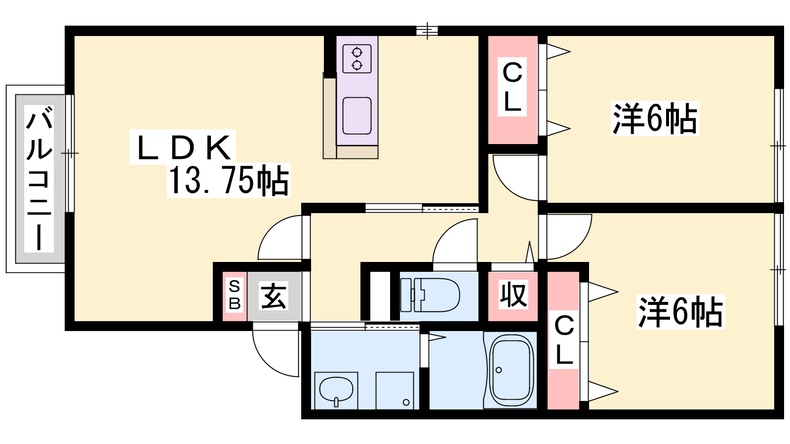 - LDK13.75帖、洋室6帖、洋室6帖