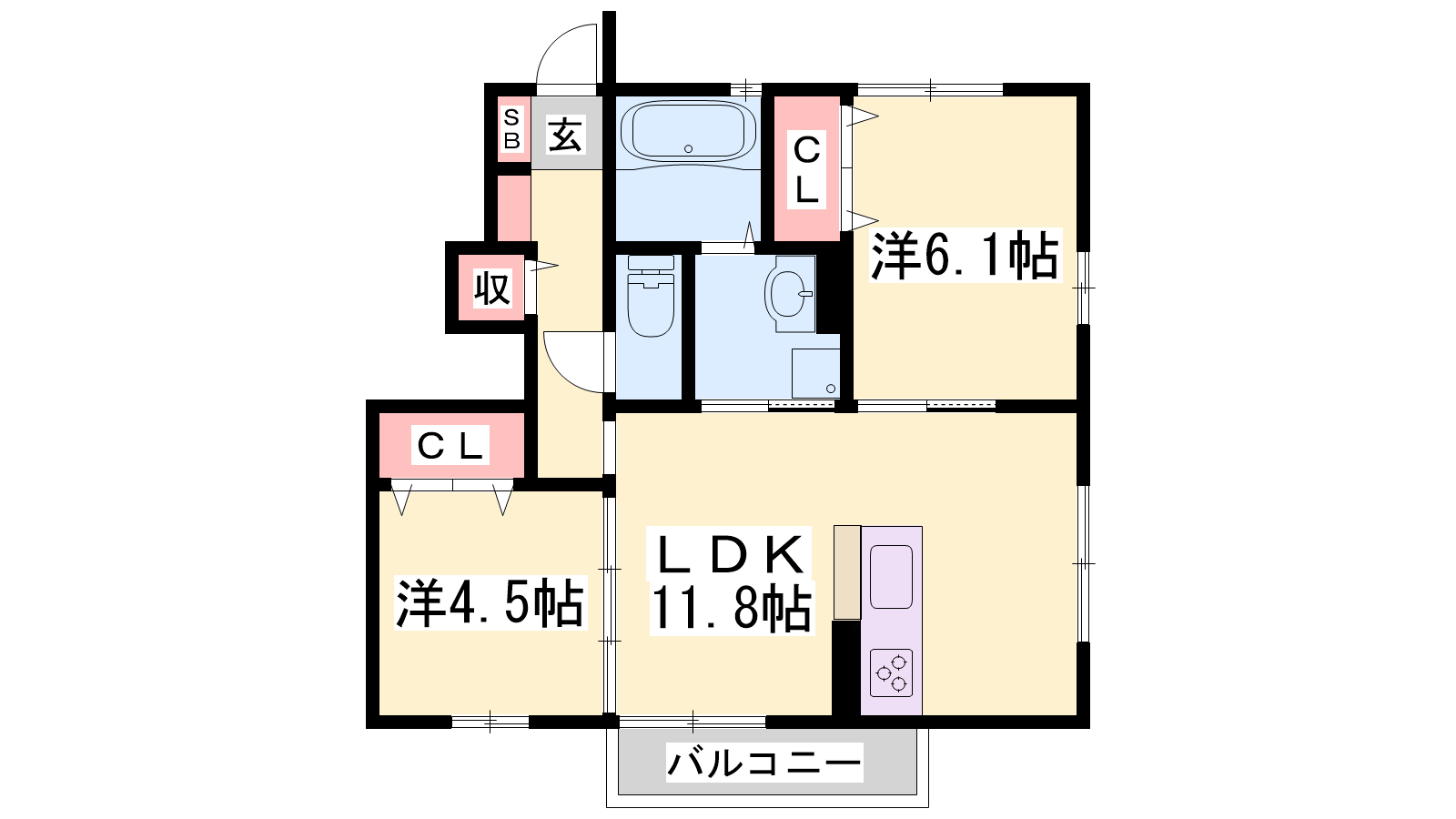 - LDK11.8帖、洋室6.1帖、洋室4.5帖