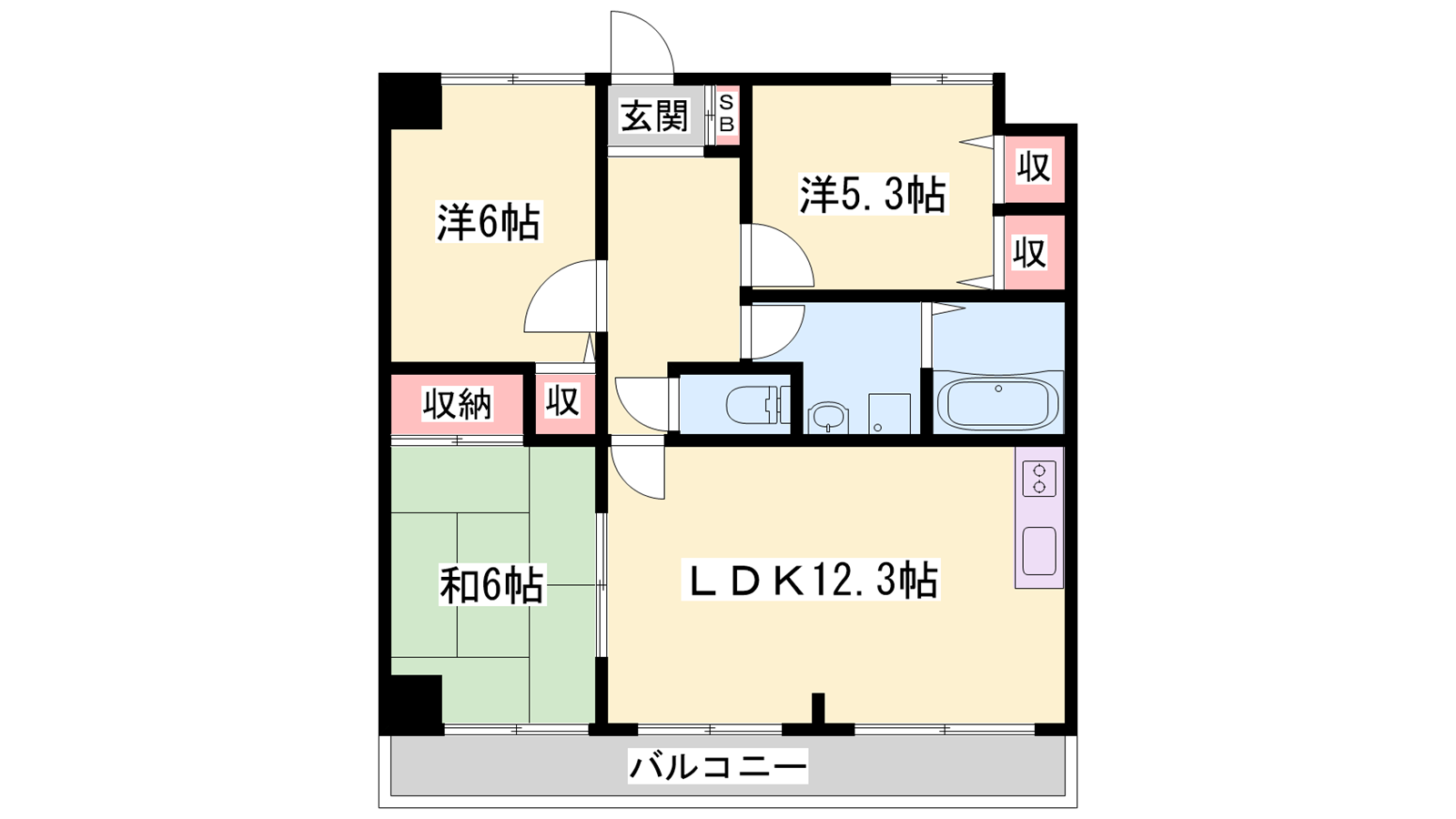 - LDK12.3帖、洋室6帖、和室6帖、洋室5.3帖