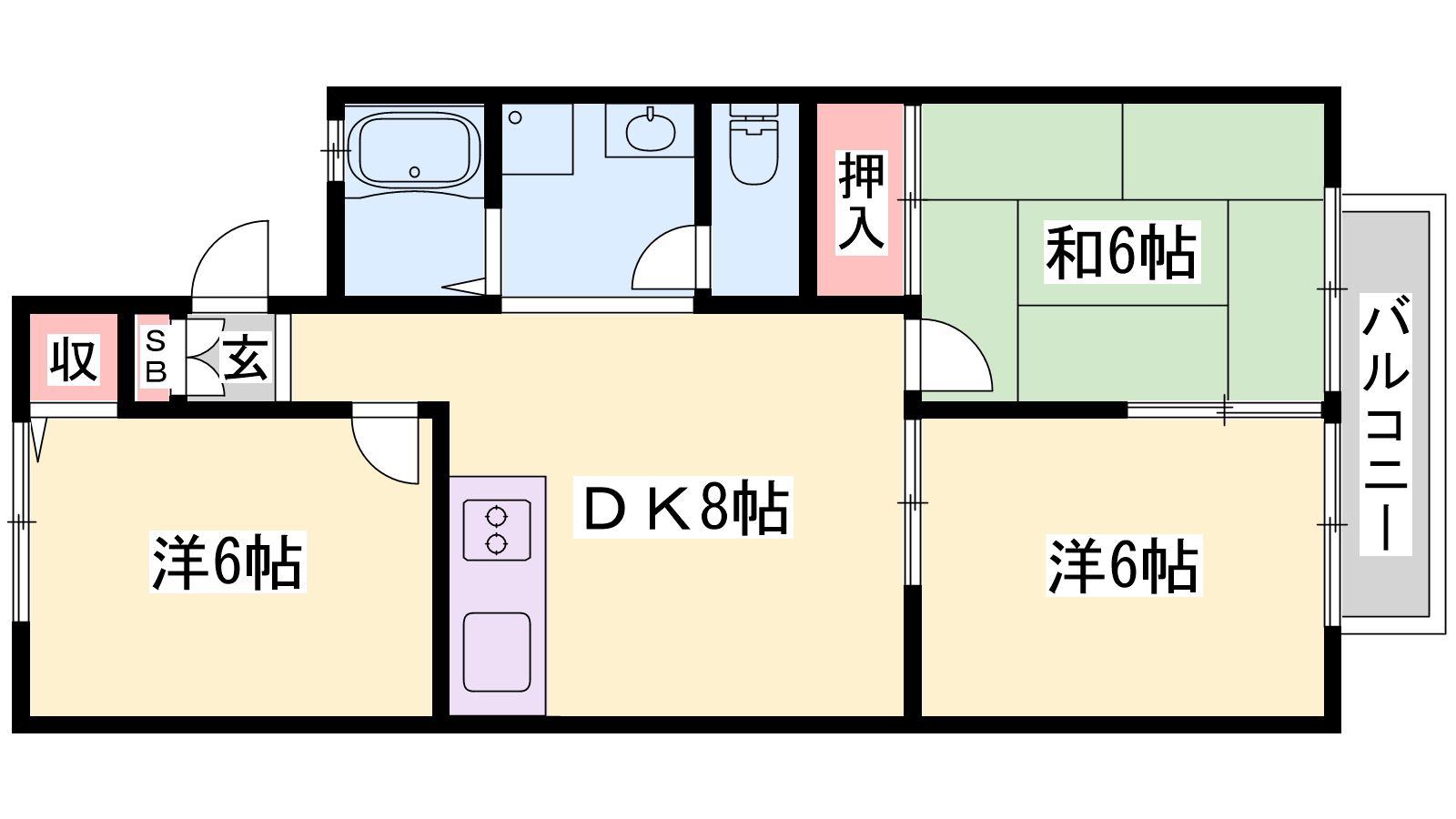 - DK8帖、洋室6帖、洋室6帖、和室6帖