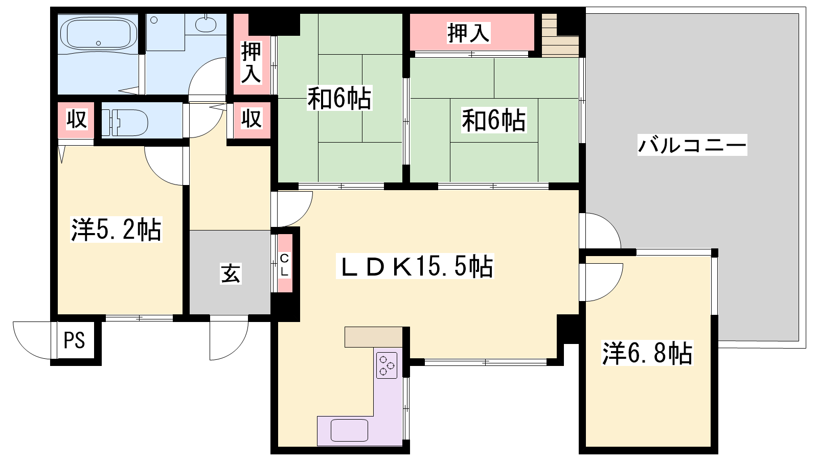 - LDK15.5帖、洋室6.8帖、洋室5.2帖、和室6帖、和室6帖