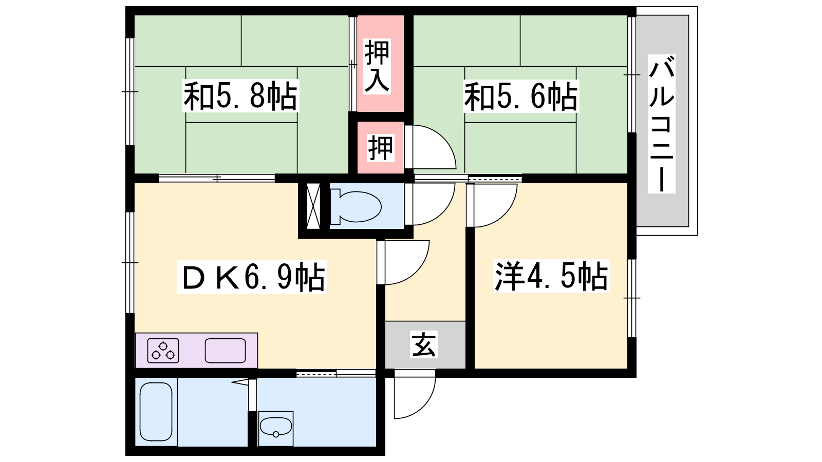 - DK6.9帖、洋室4.5帖、和室5.8帖、和室5.6帖