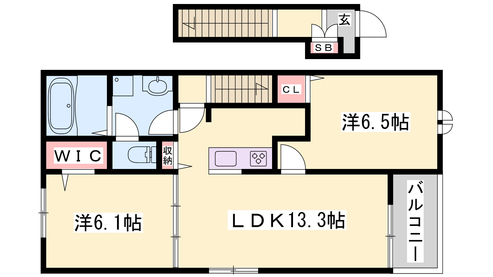 - LDK13.3帖、洋室6.5帖、洋室6.1帖
