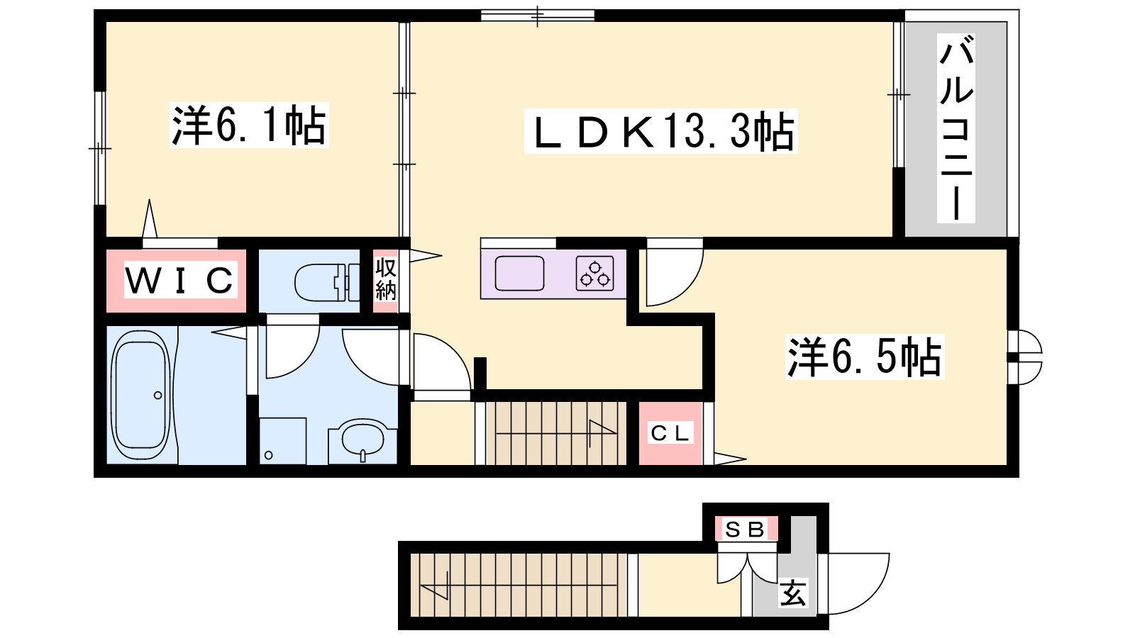 - LDK13.3帖、洋室6.5帖、洋室6.1帖