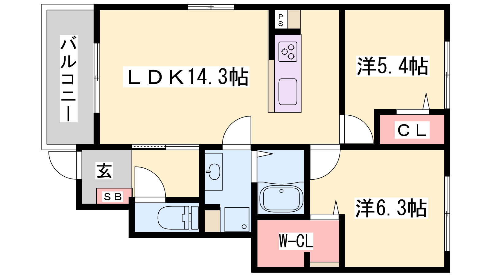- LDK14.3帖、洋室6.3帖、洋室5.4帖