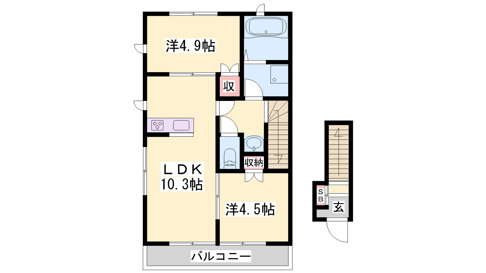 - LDK10.3帖、洋室4.9帖、洋室4.5帖