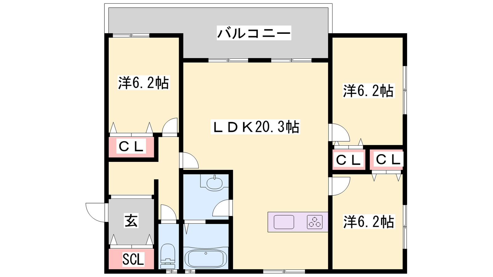 - LDK20.3帖、洋室6.2帖、洋室6.2帖、洋室6.2帖