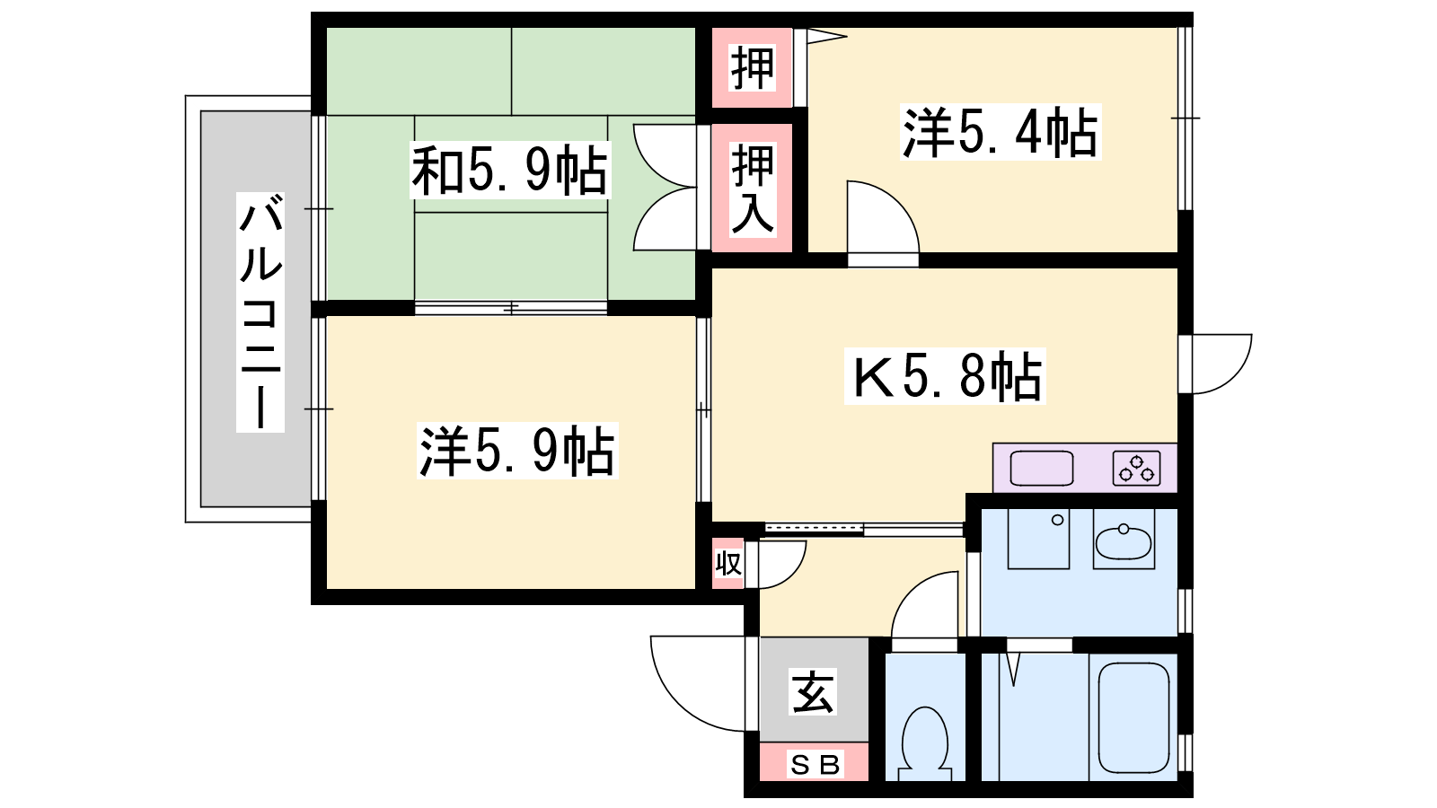 - K5.8帖、洋室5.9帖、洋室5.4帖、和室5.9帖