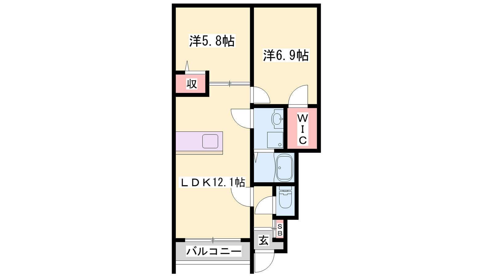 - LDK12.1帖、洋室6.9帖、洋室5.8帖