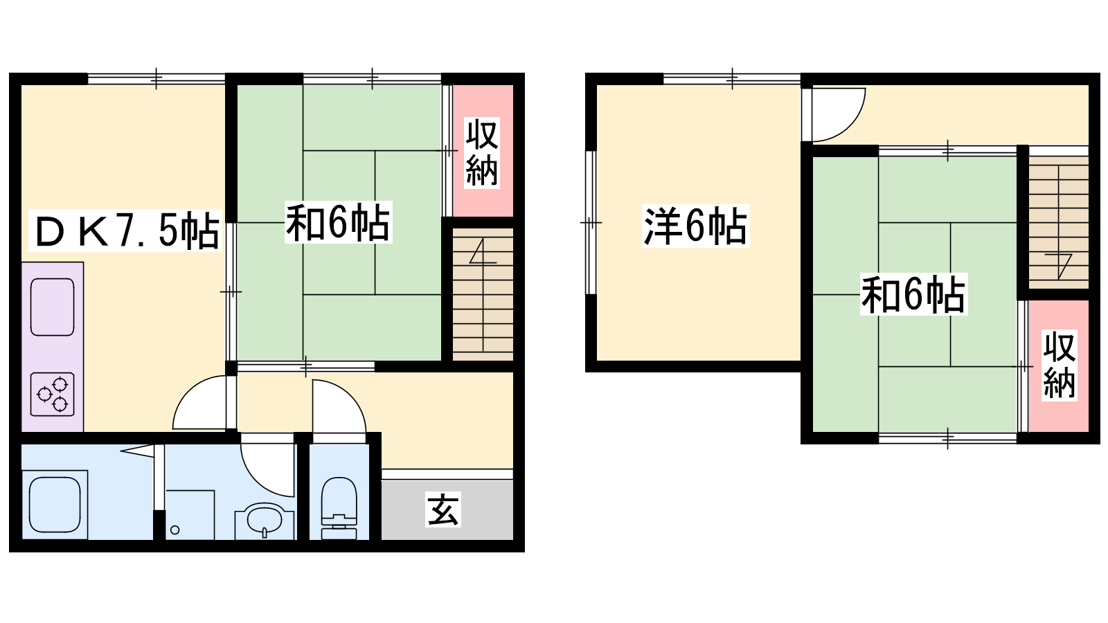 - DK7.5帖、洋室6帖、和室6帖、和室6帖