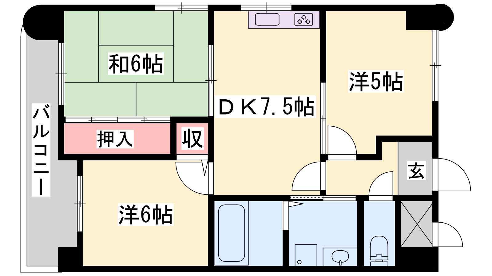 - DK7.5帖、洋室5帖、和室6帖、和室6帖