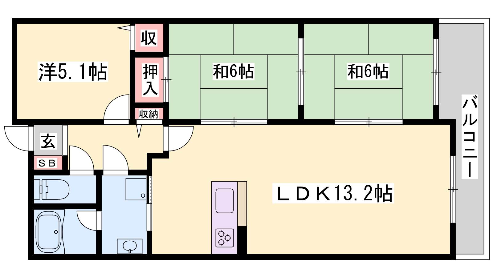 - LDK13.2帖、和室6帖、和室6帖、洋室5.1帖