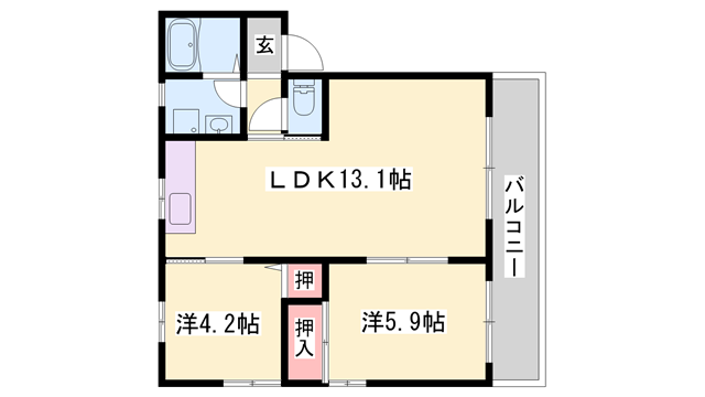 - LDK13.1帖、洋室5.9帖、洋室4.2帖
