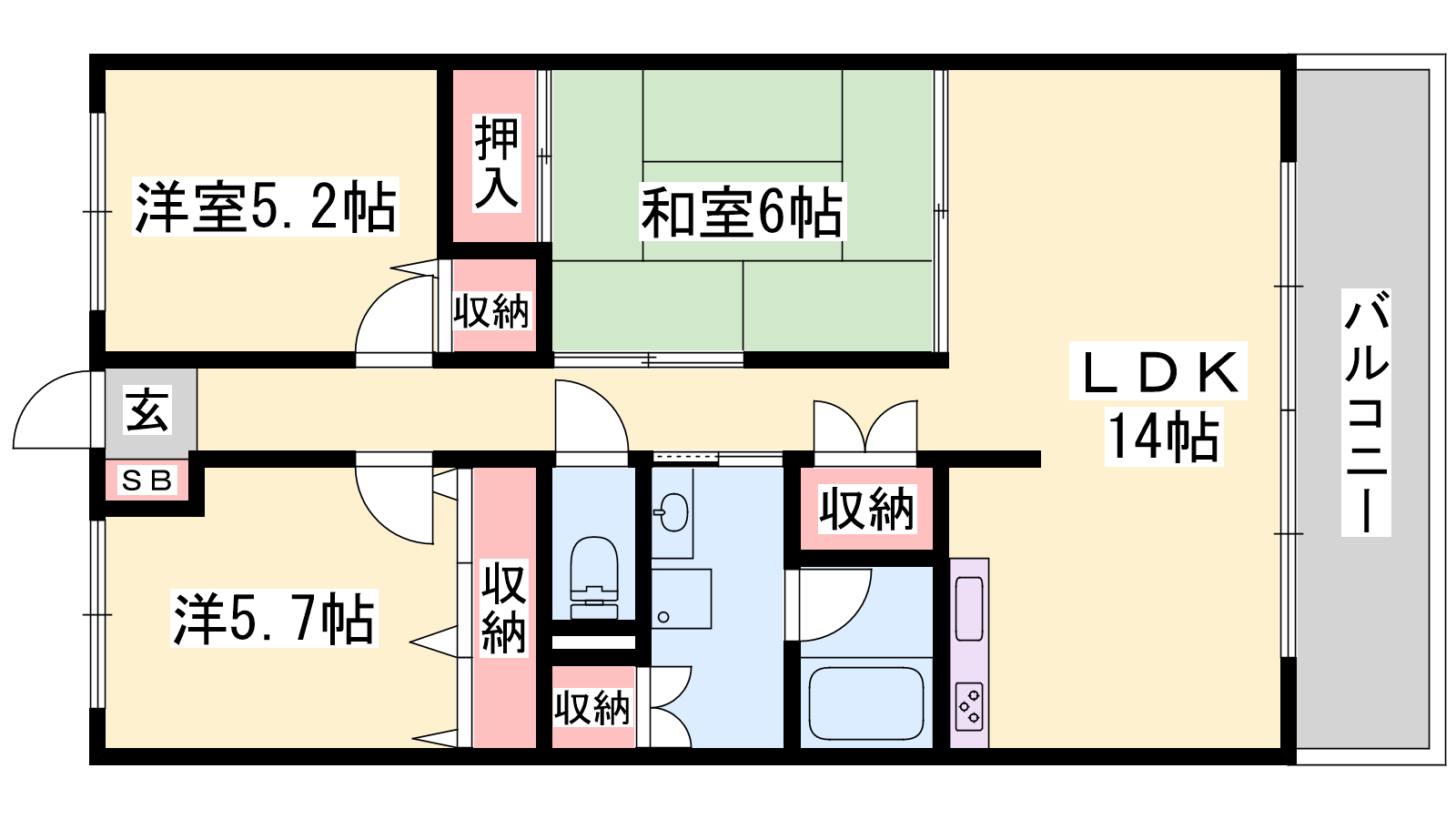 - LDK14帖、洋室5.2帖、洋室5.7帖、和室6帖