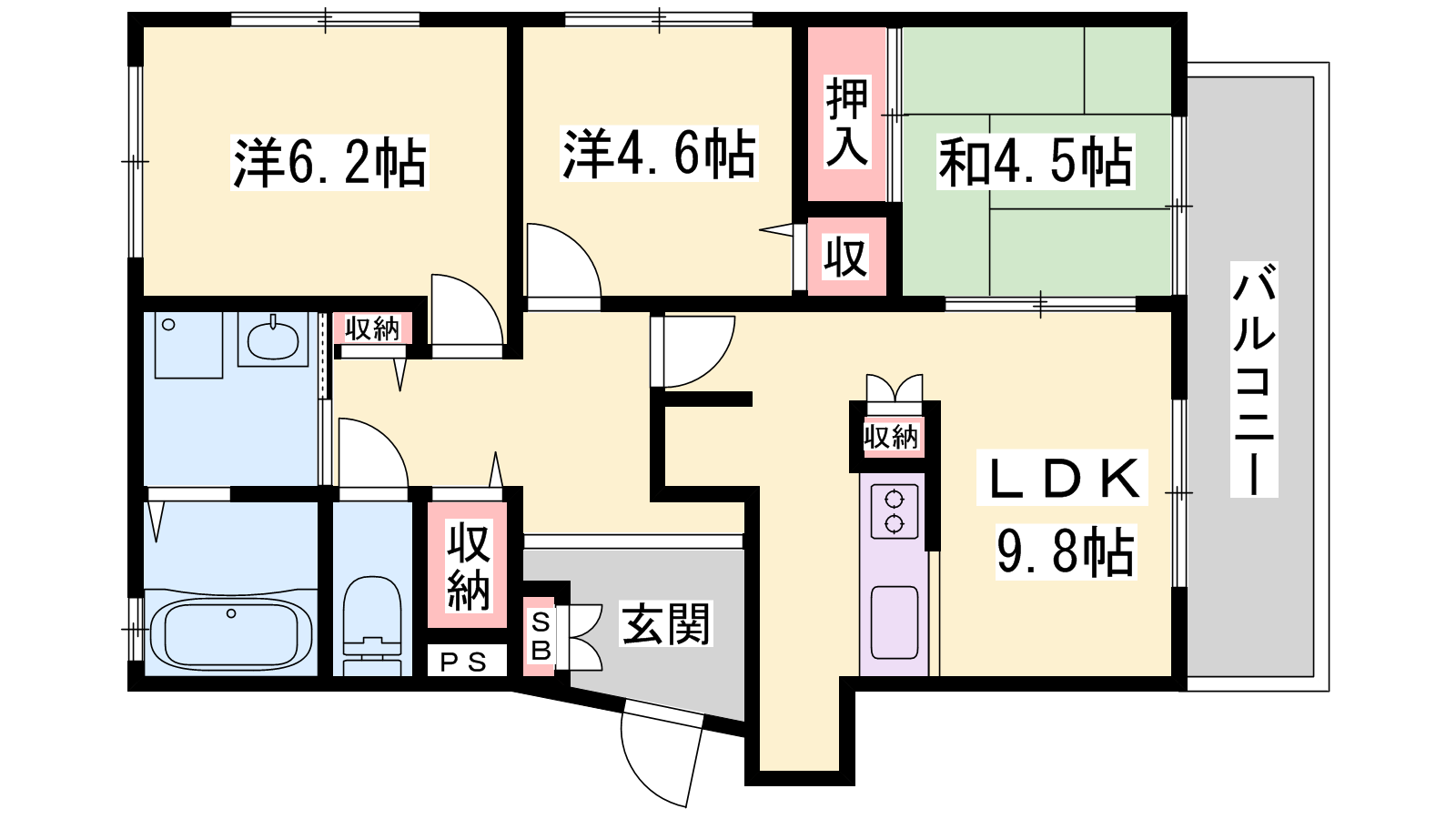 - LDK9.8帖、洋室6.2帖、洋室4.6帖、和室4.5帖