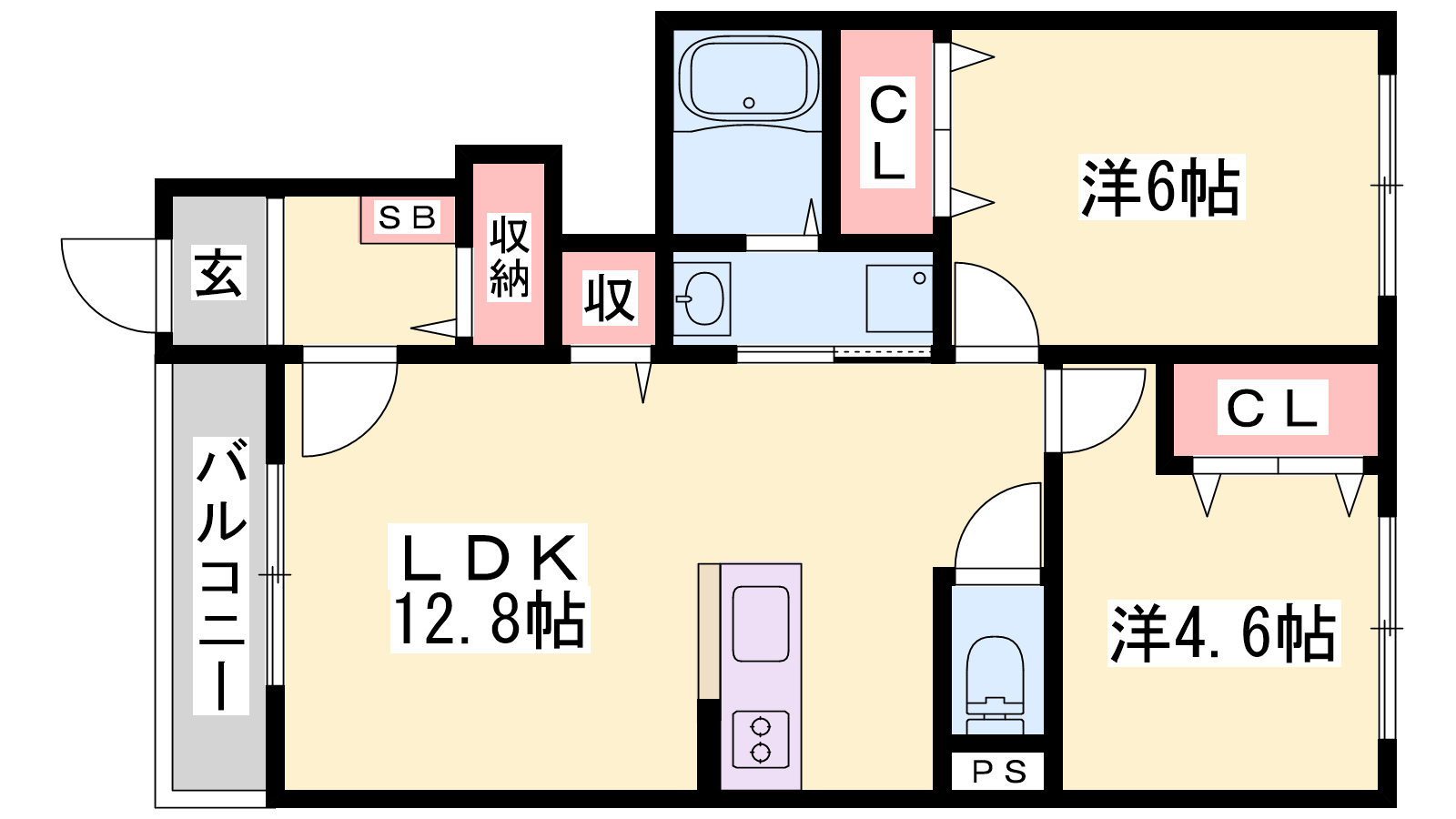 - LDK12.8帖、洋室6帖、洋室4.6帖