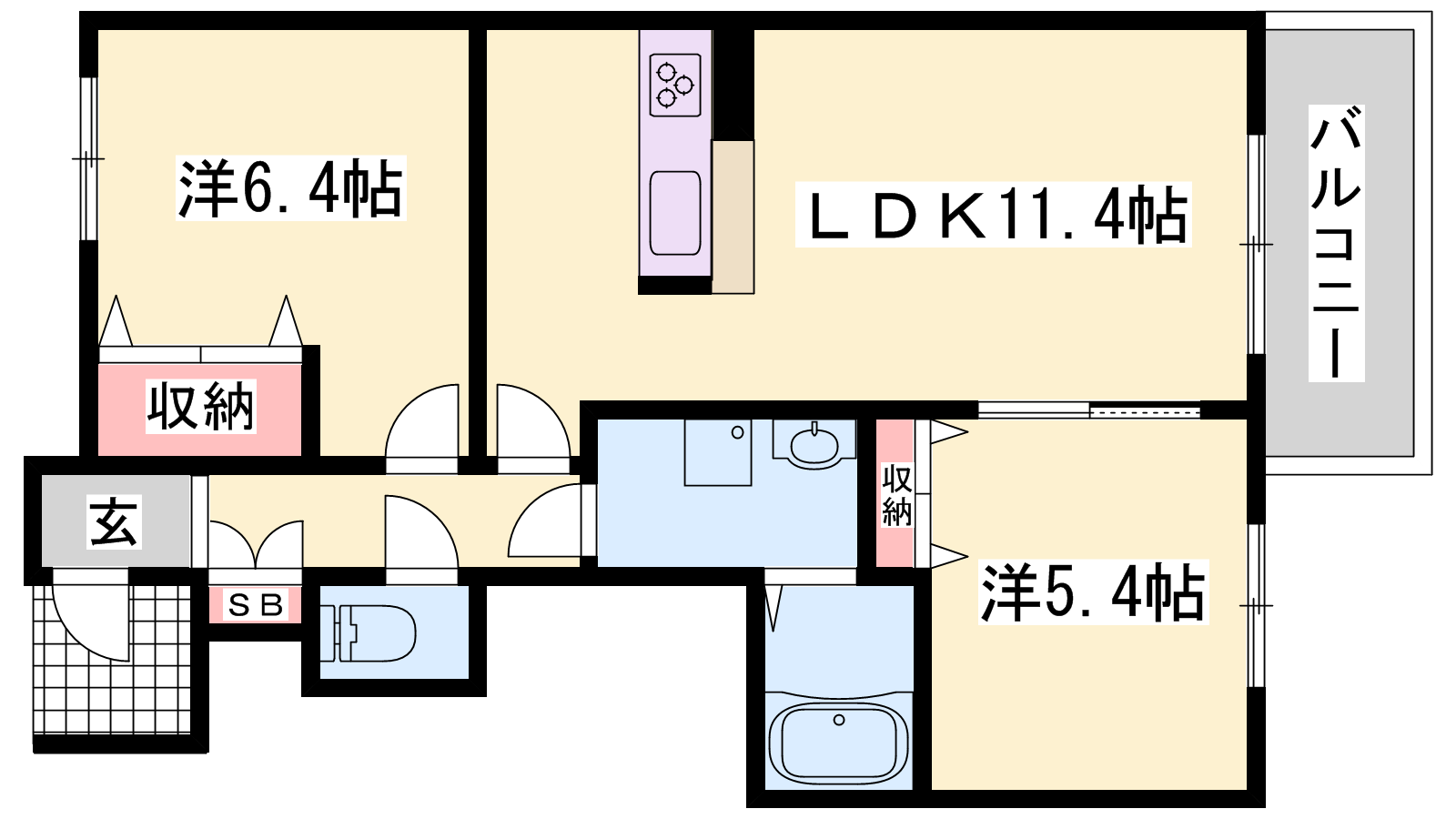 - LDK11.4帖、洋室6.4帖、洋室5.4帖