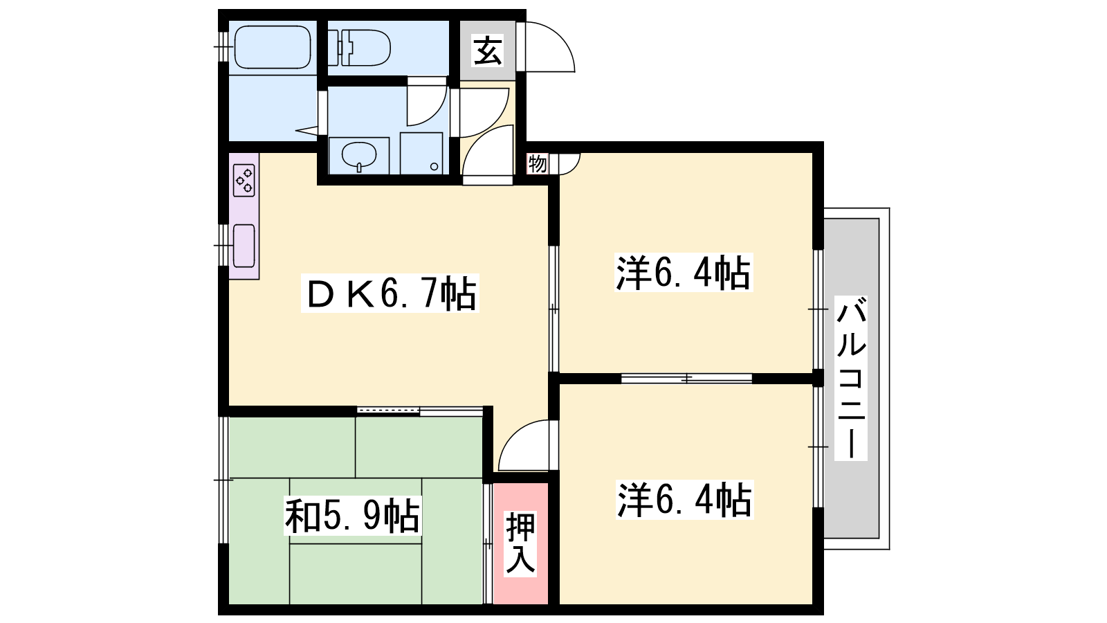 - DK6.7帖、洋室6.4帖、洋室6.4帖、和室5.9帖