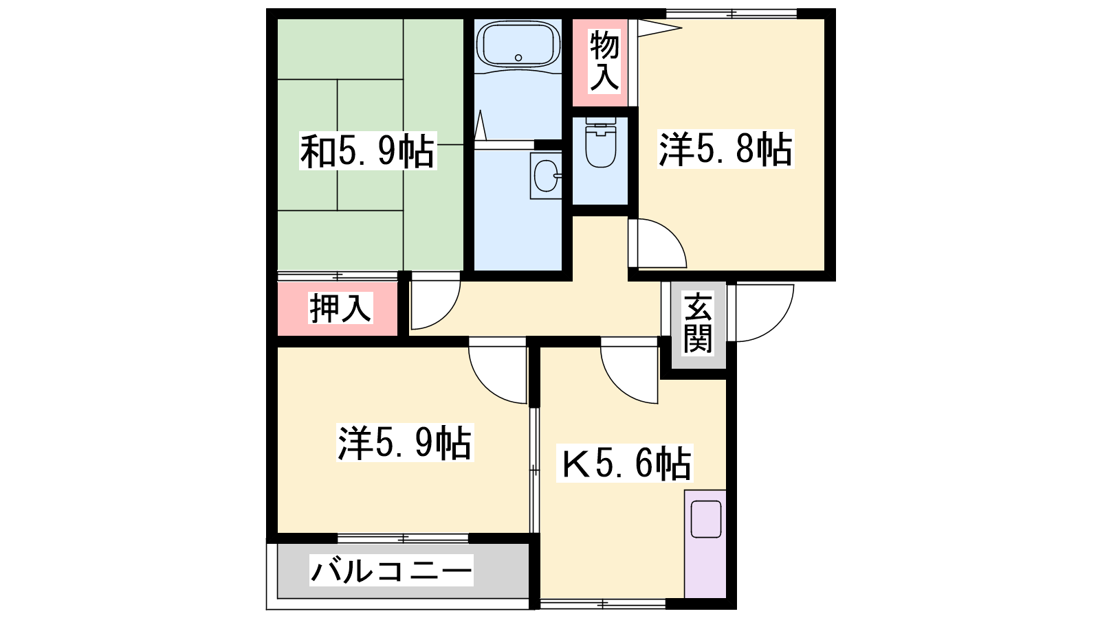 - K5.6帖、洋室5.9帖、洋室5.8帖、和室5.9帖