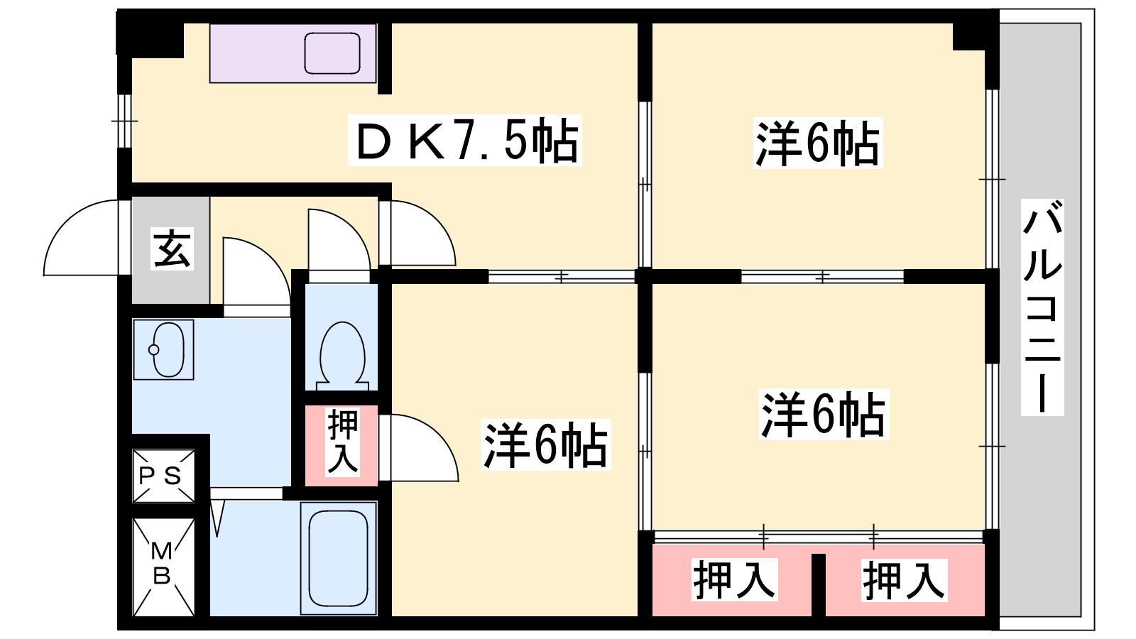 - DK7.5帖、洋室6帖、洋室6帖、洋室6帖