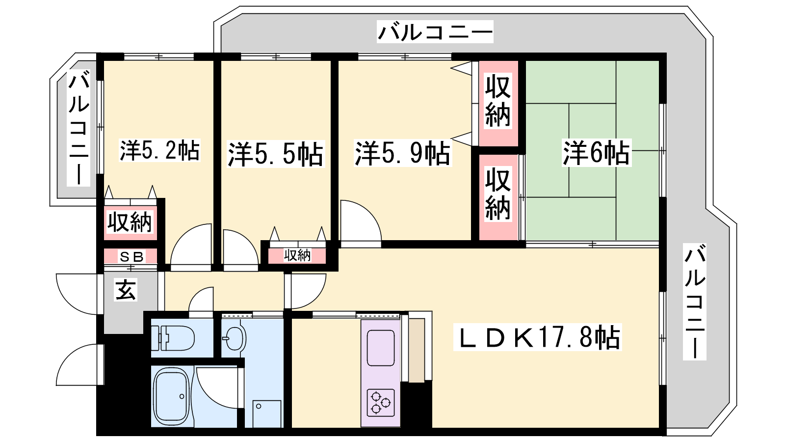 - LDK17.8帖、和室6帖、洋室5.9帖、洋室5.5帖、洋室5.2帖