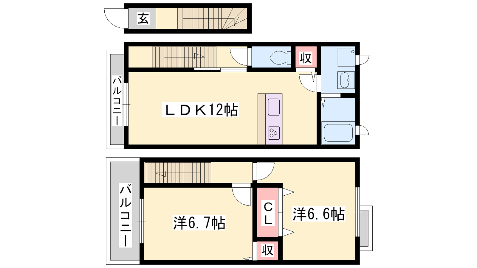 - LDK12帖、洋室6.6帖、洋室6.7帖