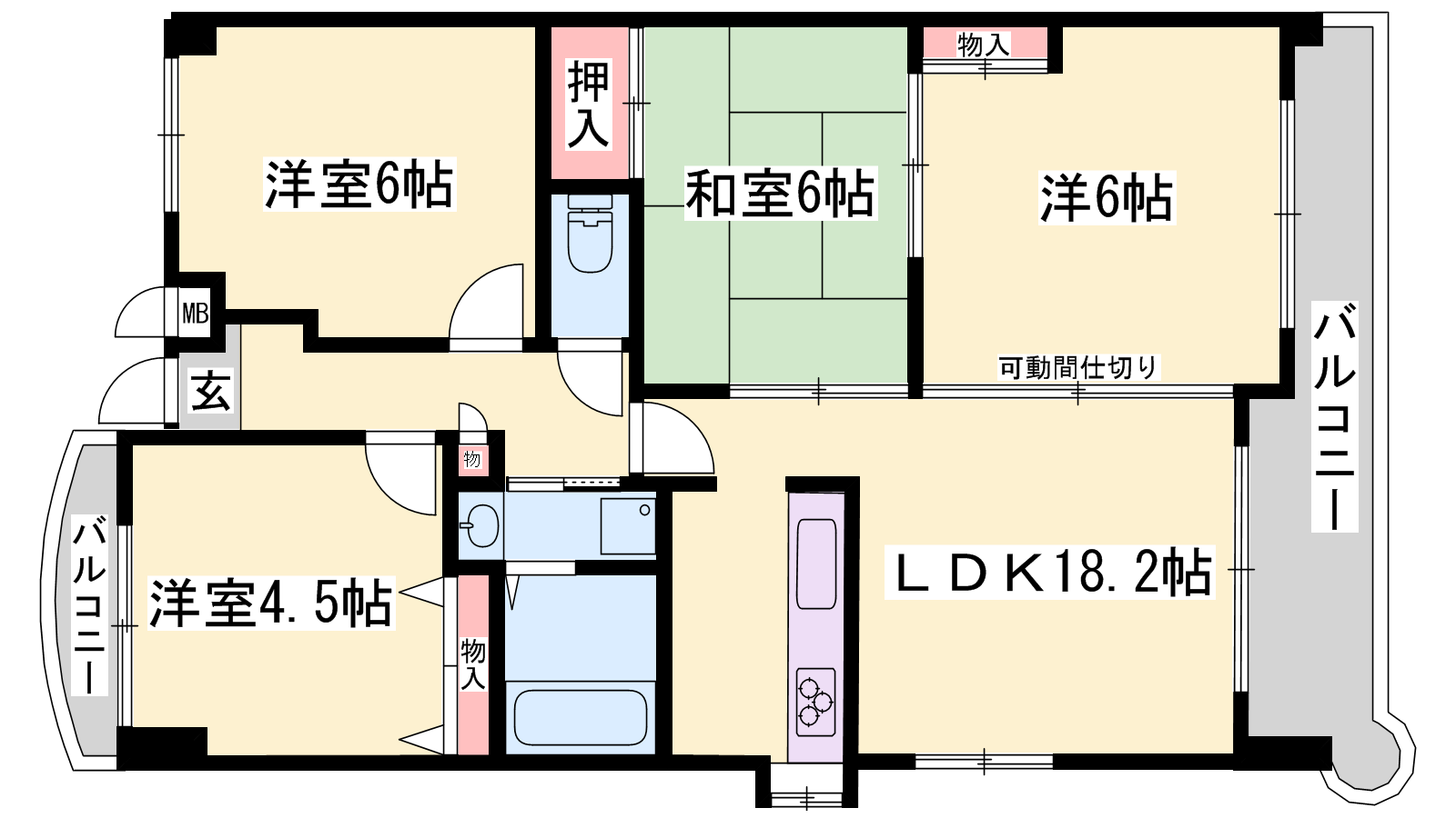 - LDK18.2帖、洋室6帖、洋室4.5帖、和室6帖