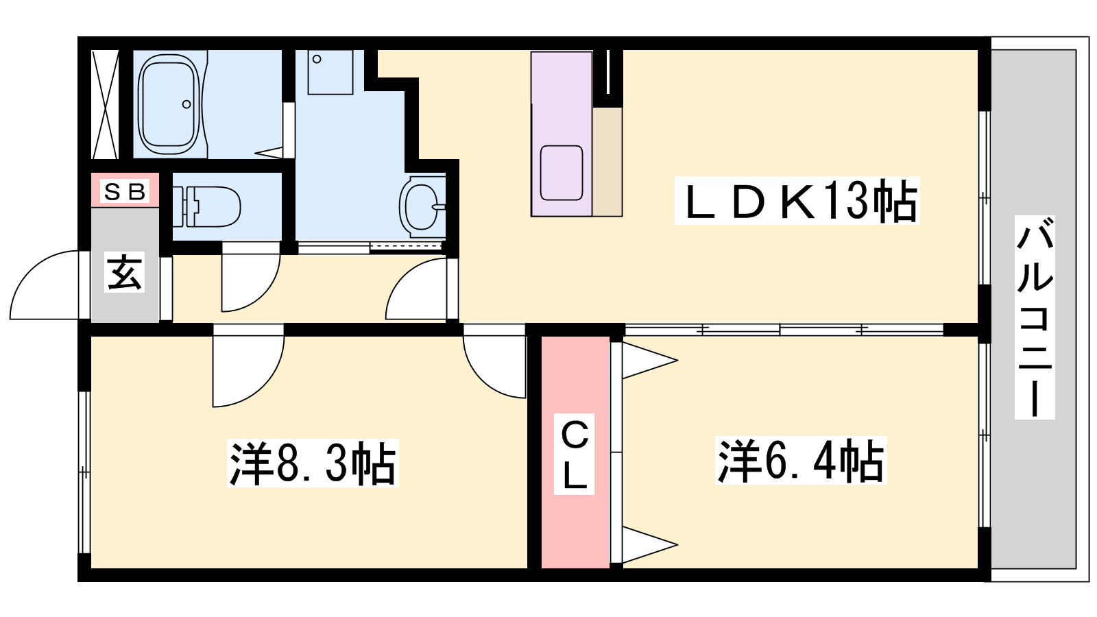 - LDK13帖、洋室8.3帖、洋室6.4帖