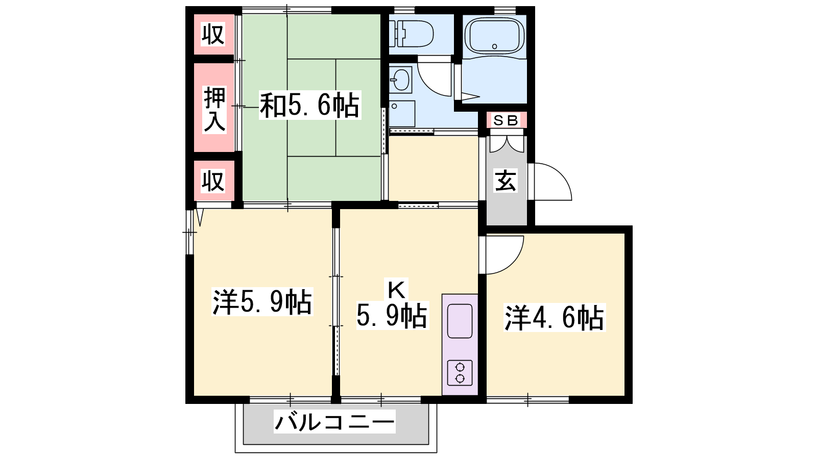 - K5.9帖、洋室5.9帖、洋室4.6帖、和室5.6帖