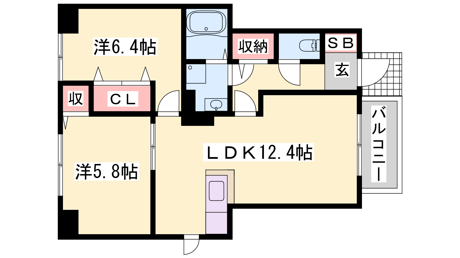 - LDK12.4帖、洋室6.4帖、洋室5.8帖