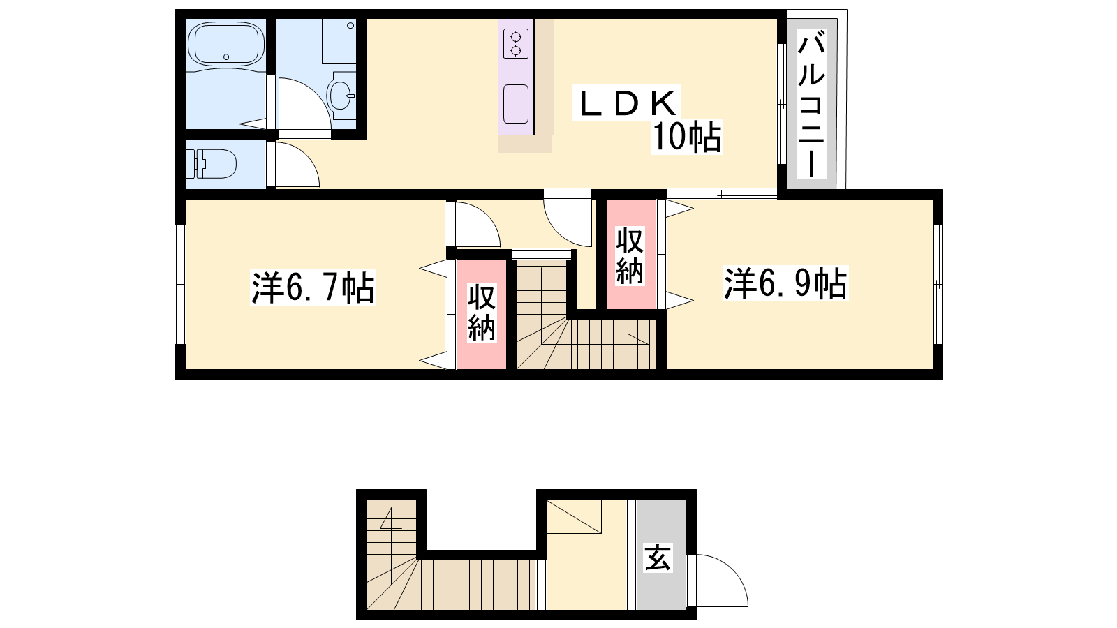 - LDK10帖、洋室6.9帖、洋室6.7帖