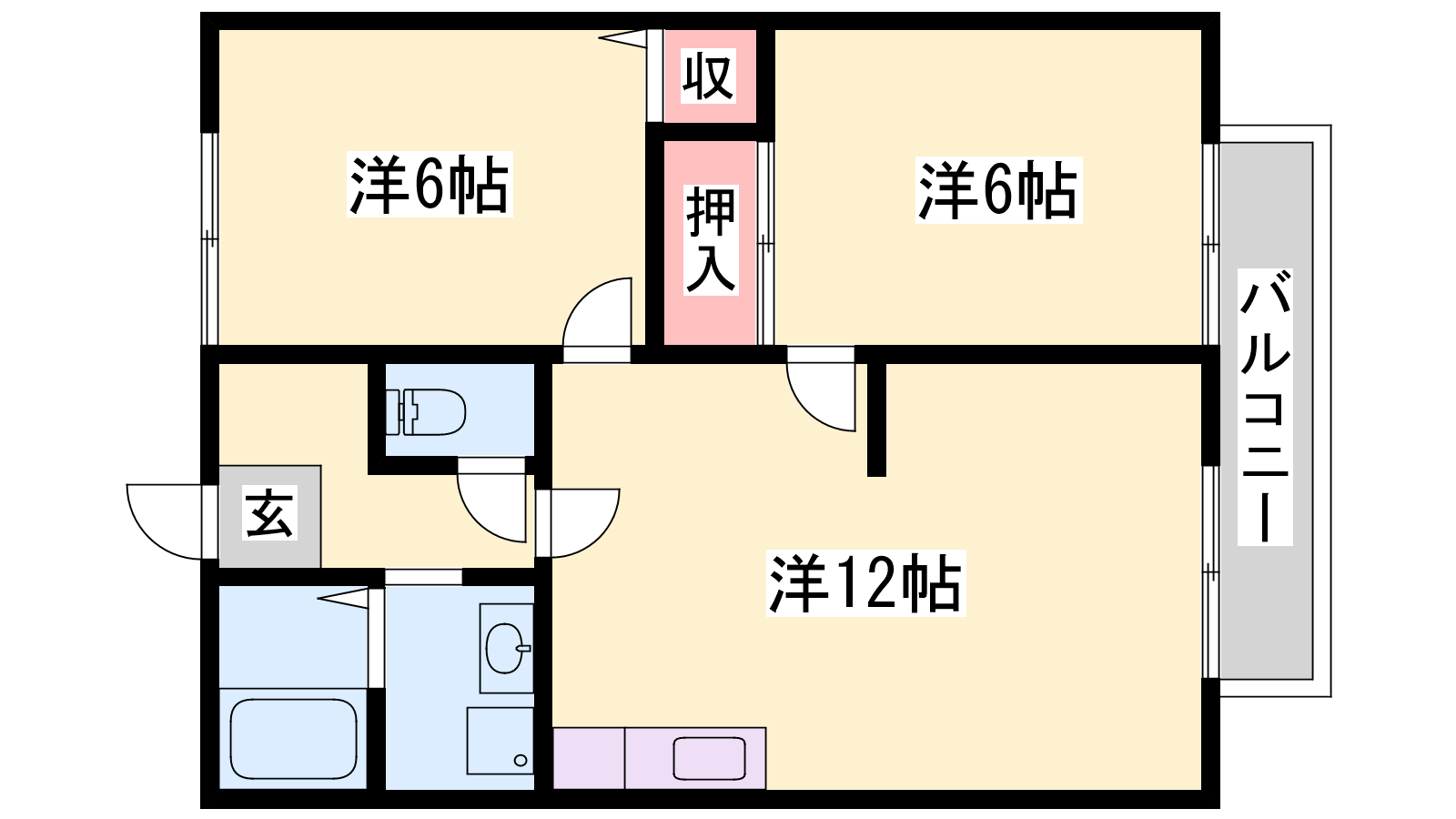 - LDK12帖、洋室6帖、洋室6帖
