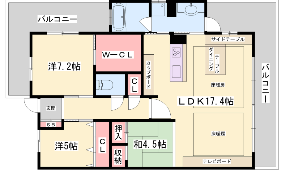 - LDK17.4帖、洋室7.2帖、洋室5帖、和室4.5帖