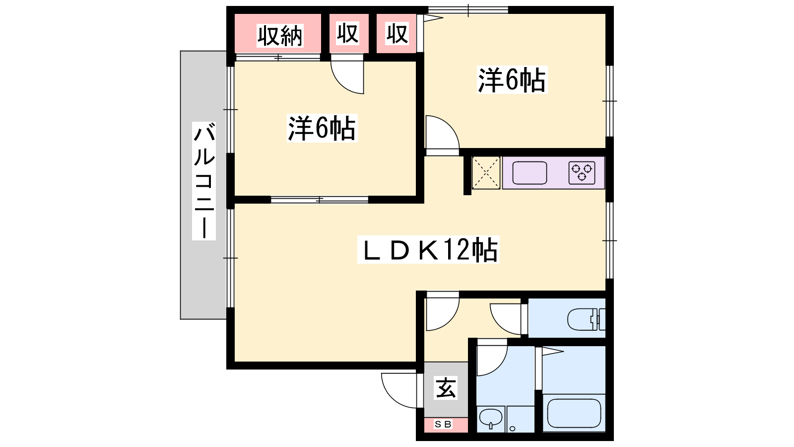 - LDK12帖、洋室6帖、洋室6帖