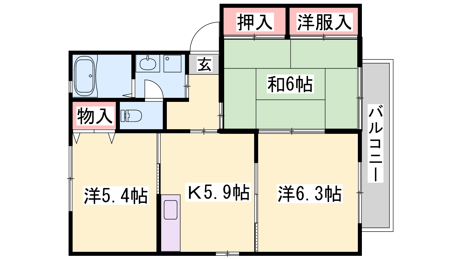 - K5.9帖、洋室6.3帖、洋室5.4帖、和室6帖