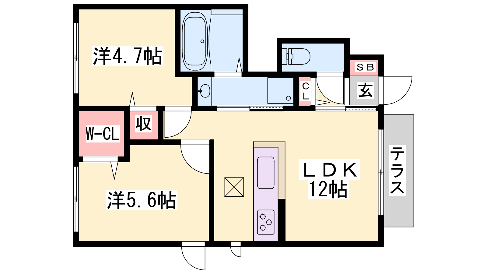 - LDK12帖、洋室5.6帖、洋室4.7帖