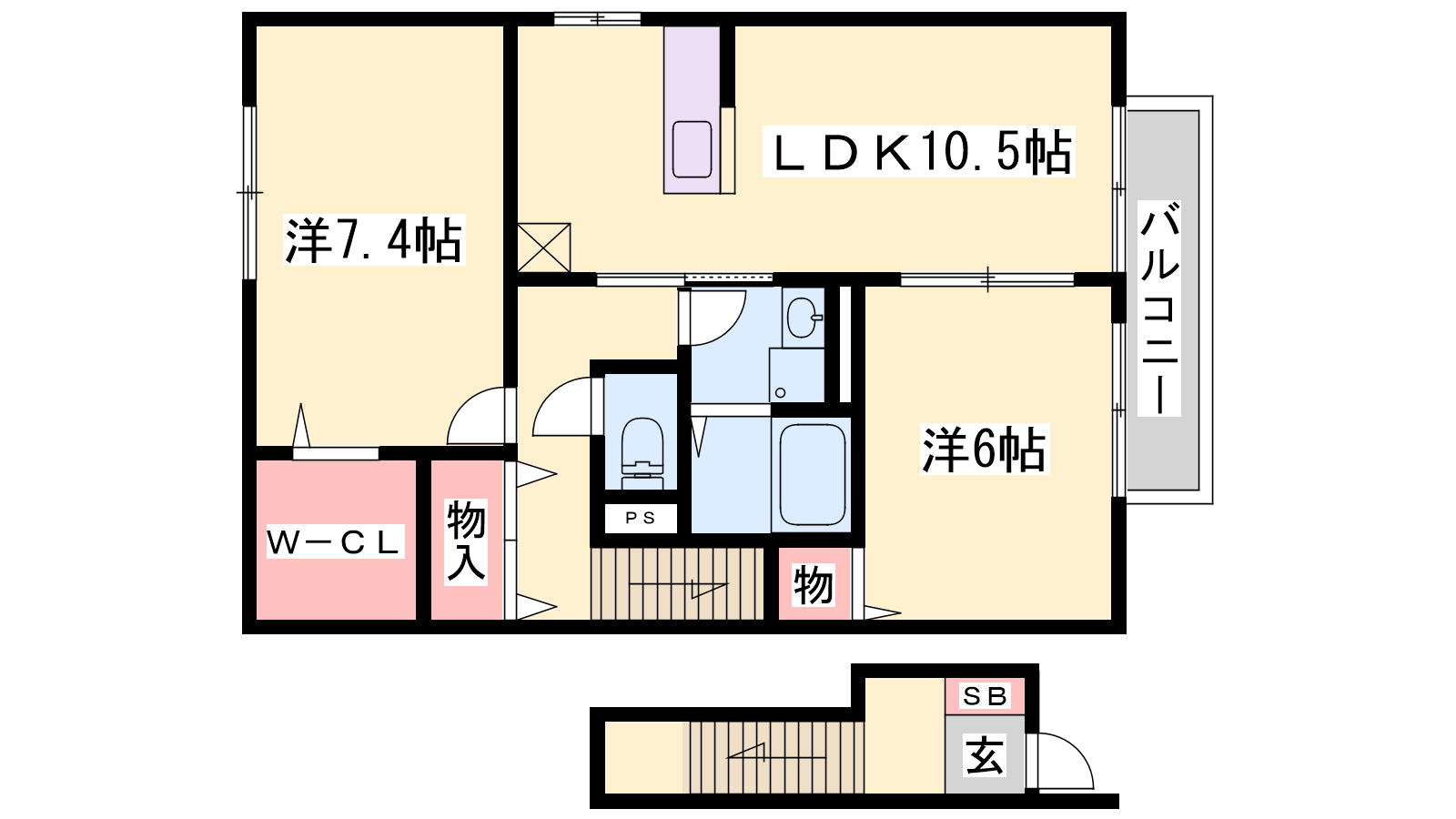 - LDK10.5帖、洋室7.4帖、洋室6帖