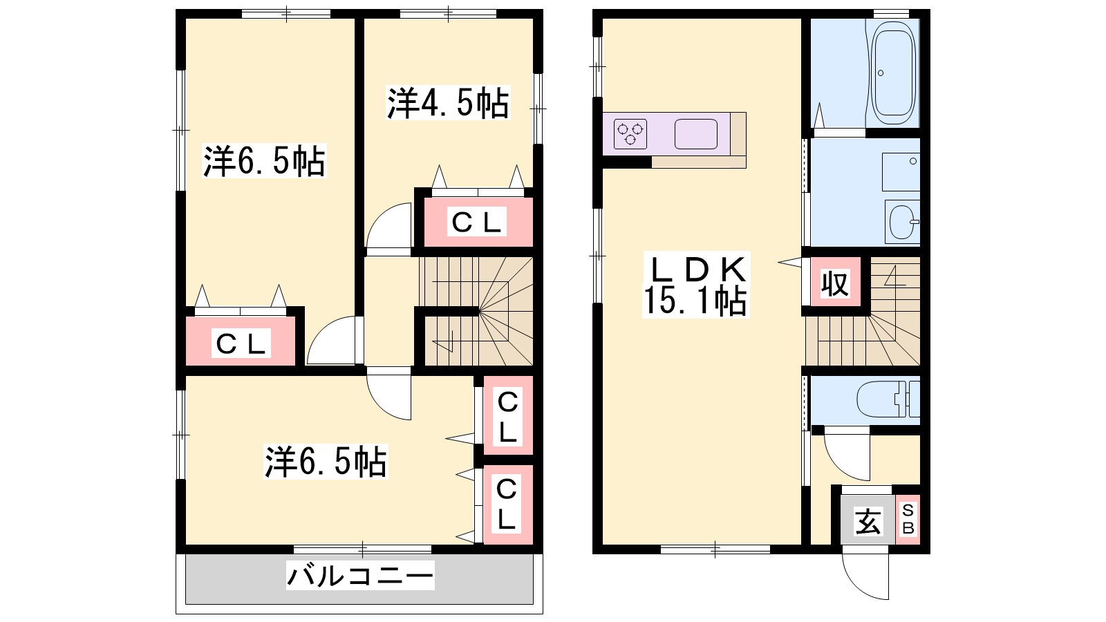 - LDK15.1帖、洋室6.5帖、洋室6.5帖、洋室4.5帖