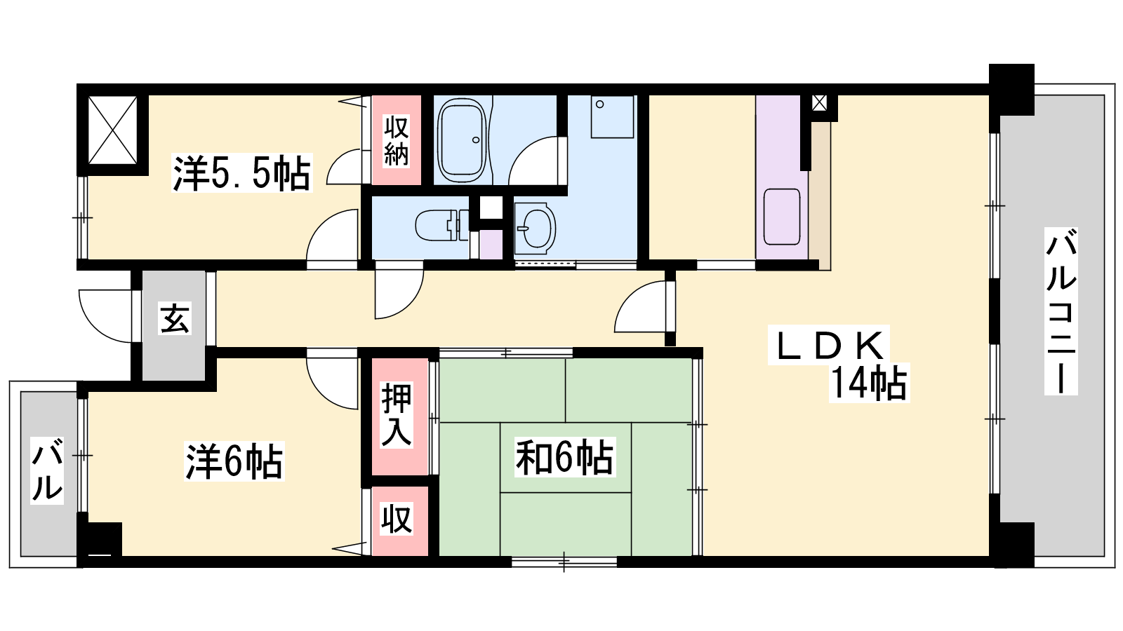 - LDK14帖、洋室6帖、洋室5.5帖、和室6帖