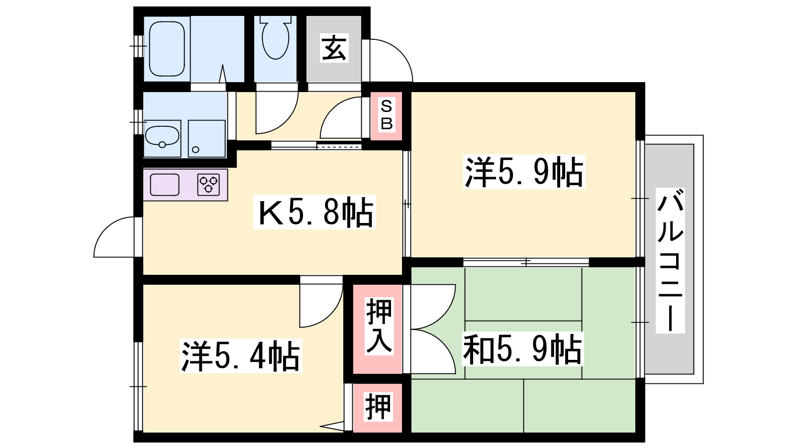 - K5.8帖、洋室5.9帖、洋室5.4帖、和室5.9帖