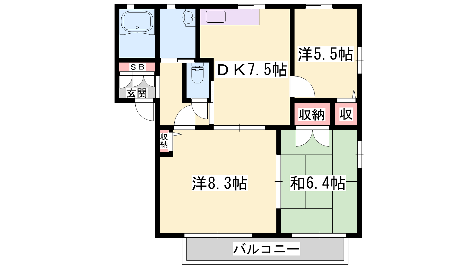 - DK7.5帖、洋室8.3帖、洋室5.5帖、和室6.4帖