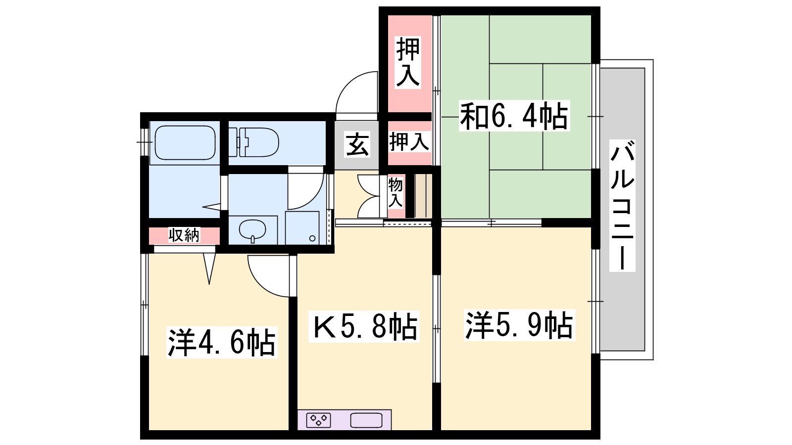 - K5.8帖、和室6.4帖、洋室5.9帖、洋室4.6帖