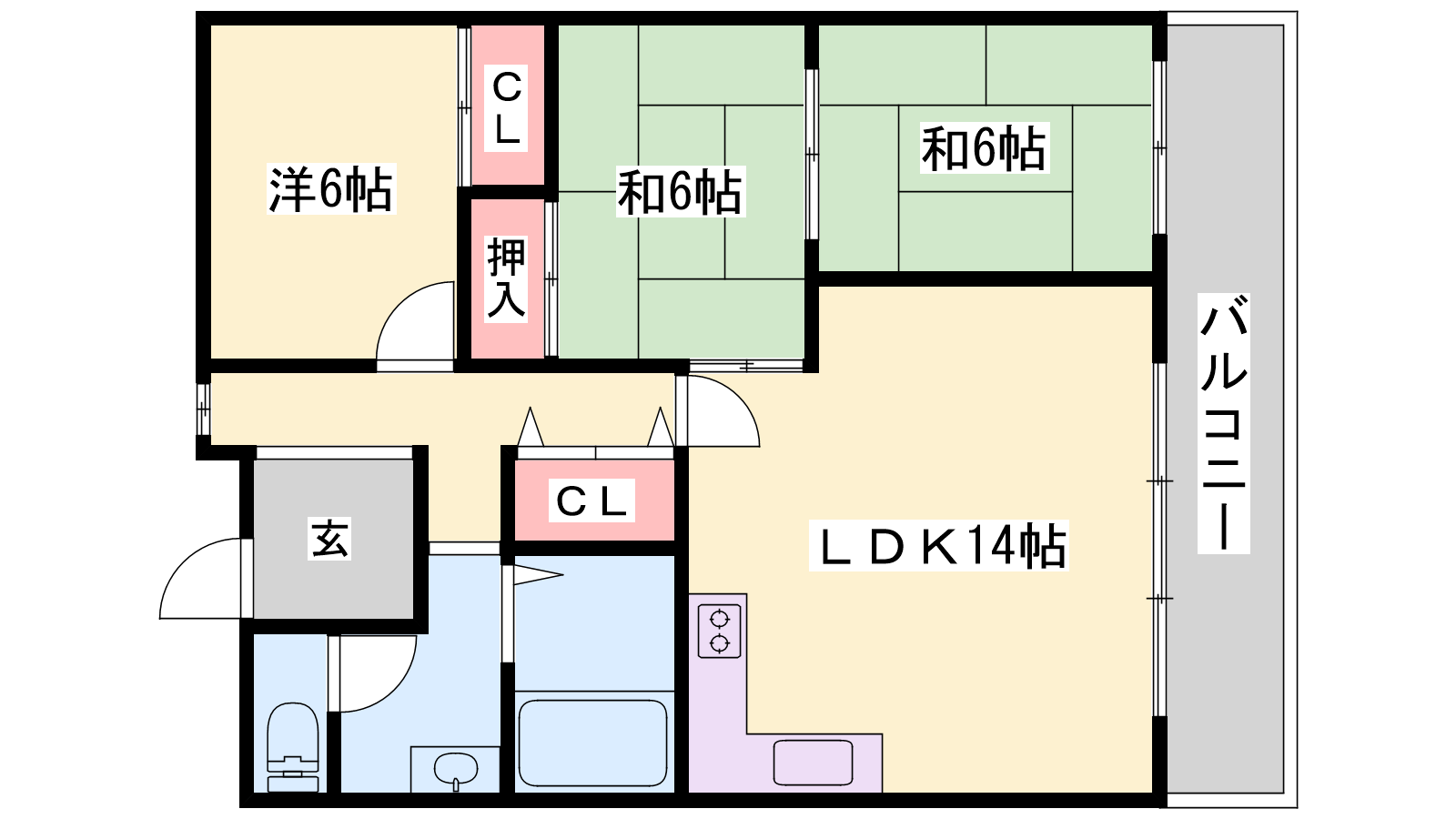 - LDK14帖、洋室6帖、和室6帖、和室6帖