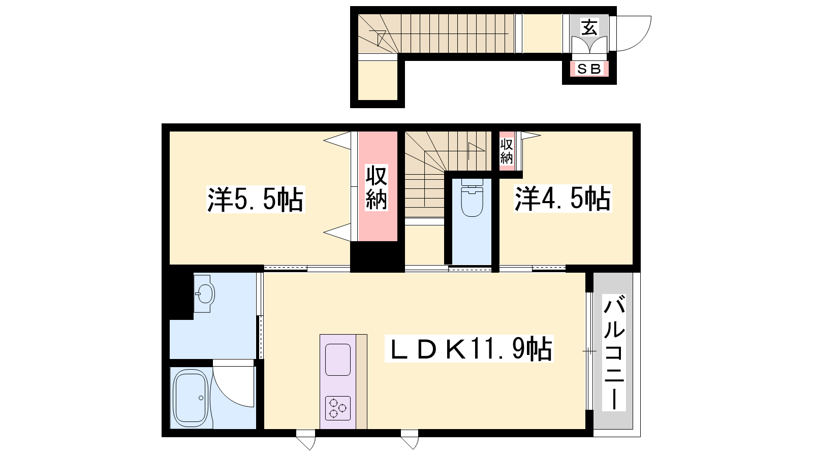 - LDK11.9帖、洋室5.5帖、洋室4.5帖