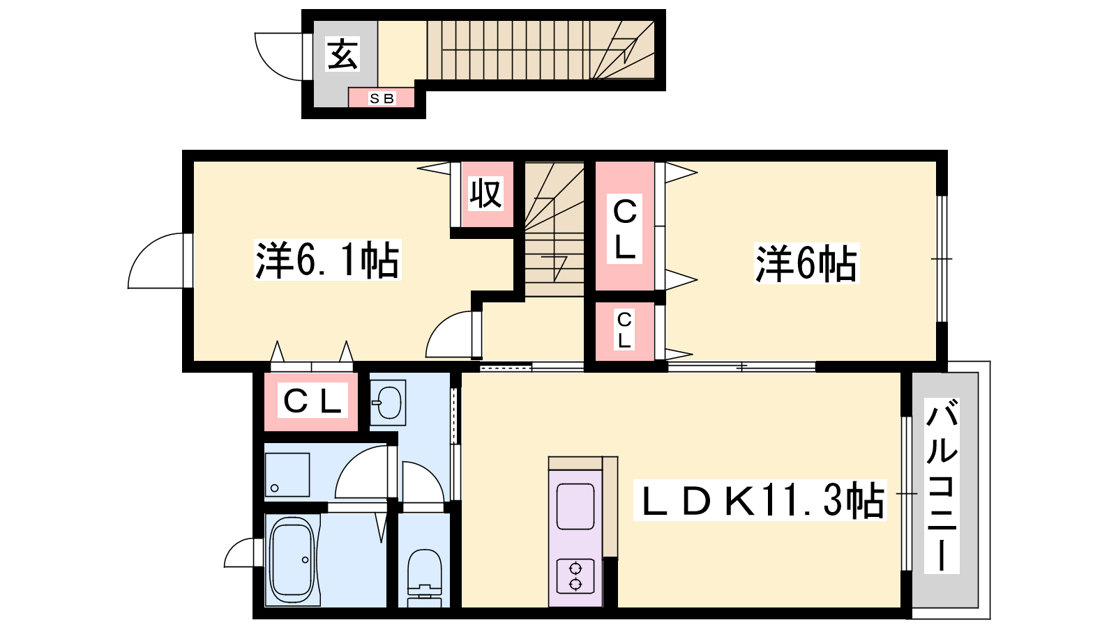 - LDK11.3帖、洋室6帖、洋室6.1帖