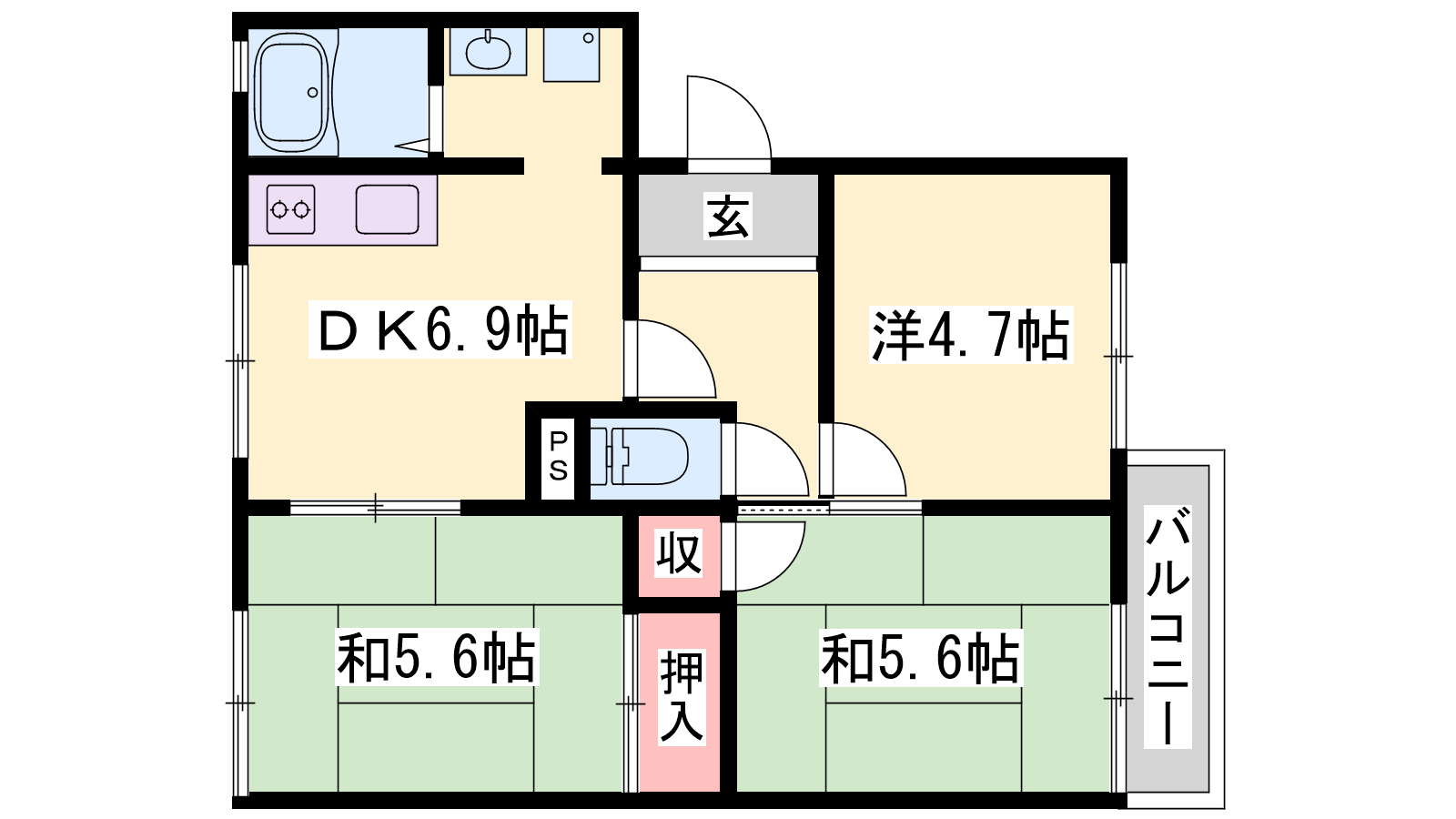 - DK6.9帖、洋室4.7帖、和室5.6帖、和室5.6帖