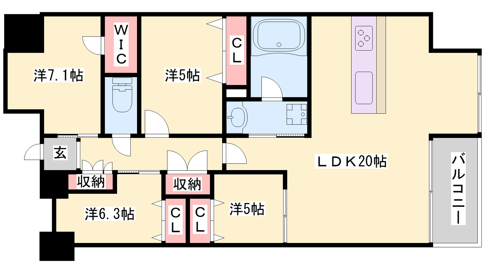 - LDK20帖、洋室7.1帖、洋室5帖、洋室5帖